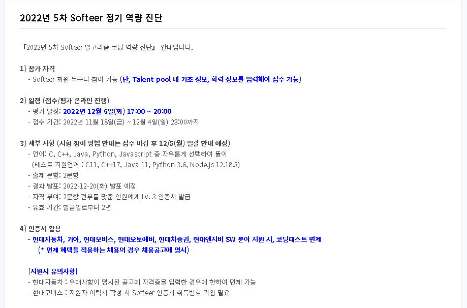 오늘은 5차 소프티어 정기 역량 진단 평가를 보았고 짧게 후기를 남겨볼까 합니다.
