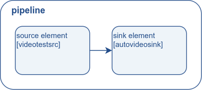 이번 튜토리얼에서는 videotestsrc와 autovideosink 두 element를 생성해볼 것이다. 여기서는 filter element는 존재하지 않는다. 그래서 파이프파인은 아래와 같이 구성이 된다.