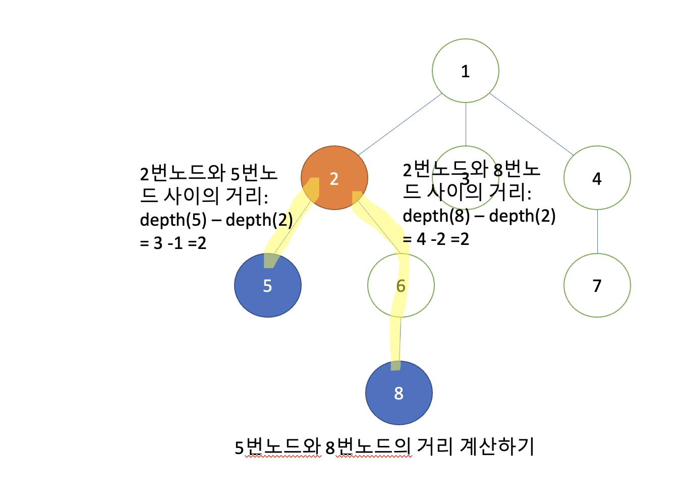 위의 공식에 따라서 5번과 8번 노드 사이의 거리는 3 + 4 - 2 * 2 = 3이 될 수 있음을 알 수 잇습니다.
