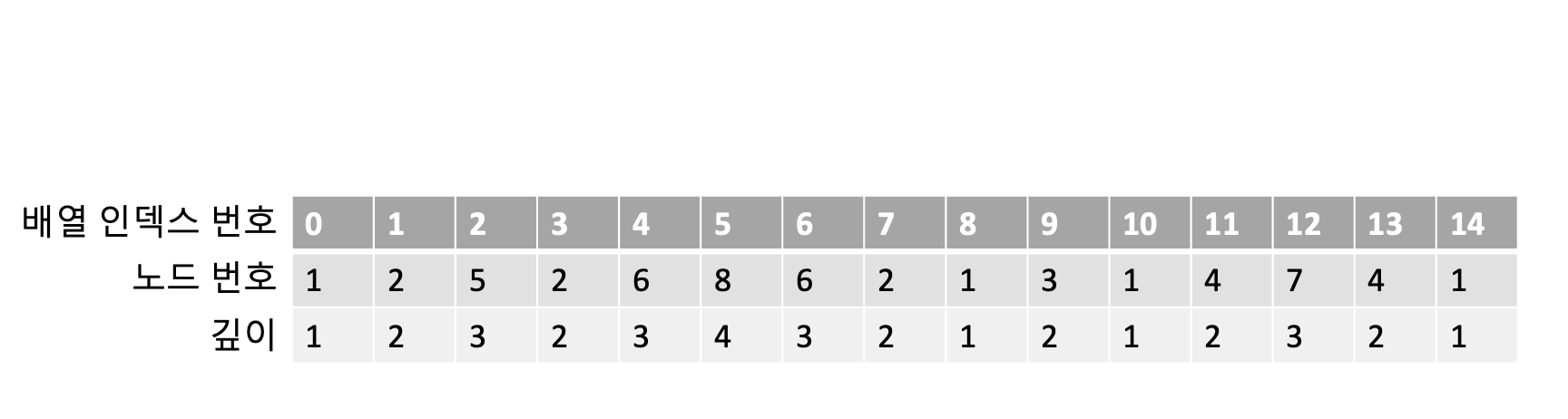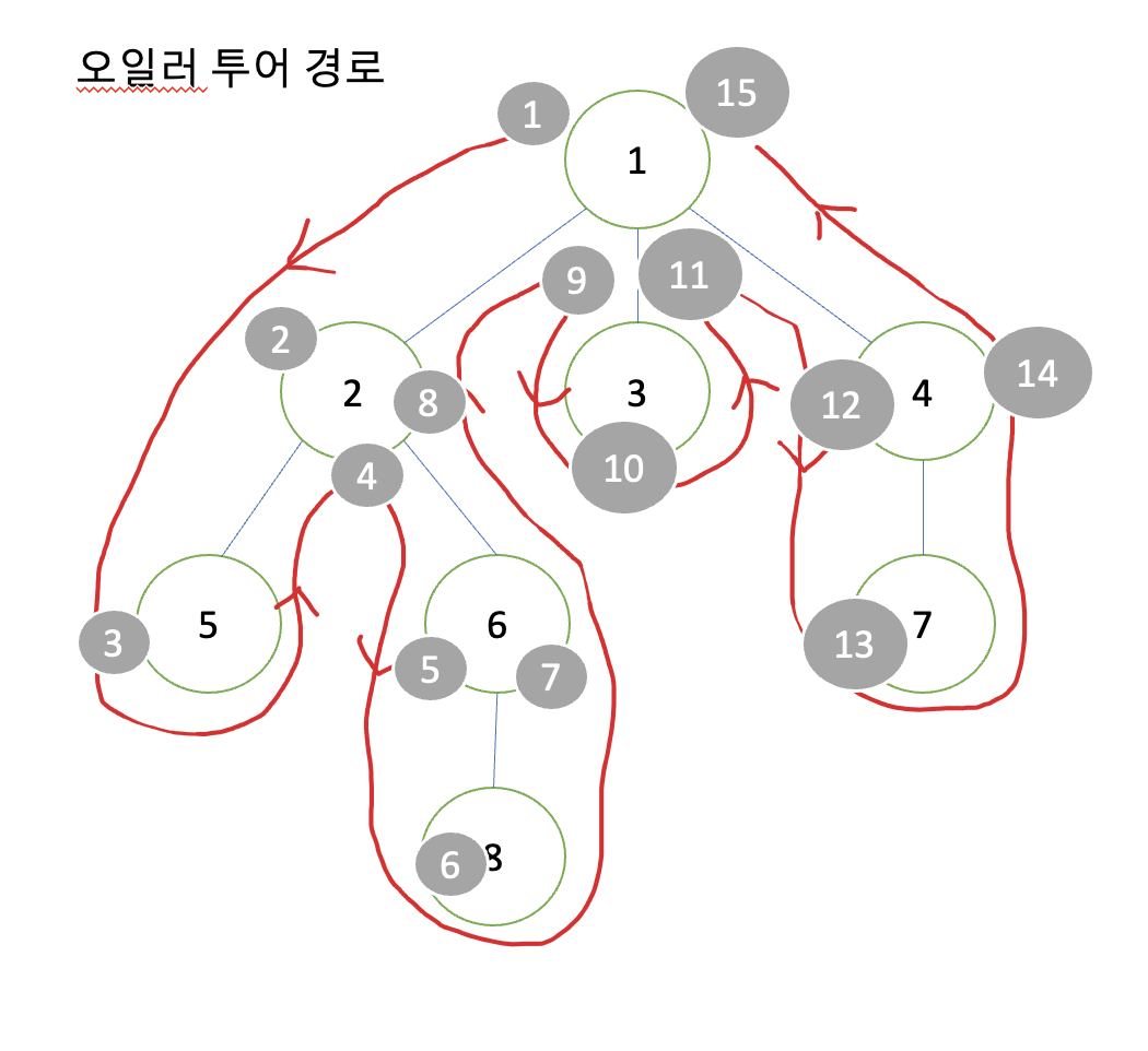 오일러투어투리는 트리순회배열을 기반으로 하는데 배열을 만들기 위해, 트리의 깊이를 노드번호와 같이 탐색한 순서대로 배열에 넣어주겠습니다. 그러면 다음과 같은 배열이 만들어질 것입니다. 배열을 만들었긴 하였는데 아직까지는 어떤 용도로 이 배열이 사용될지는 감이잡히지 않네요.