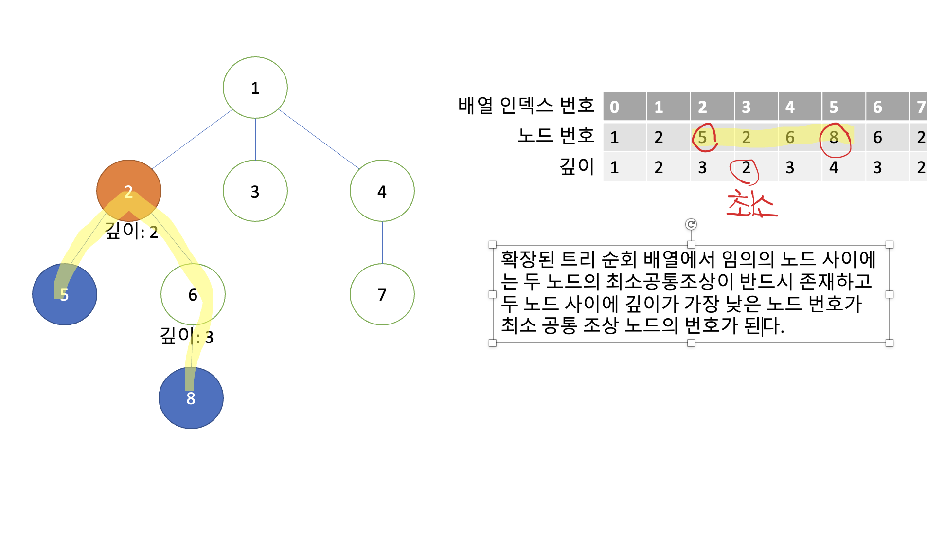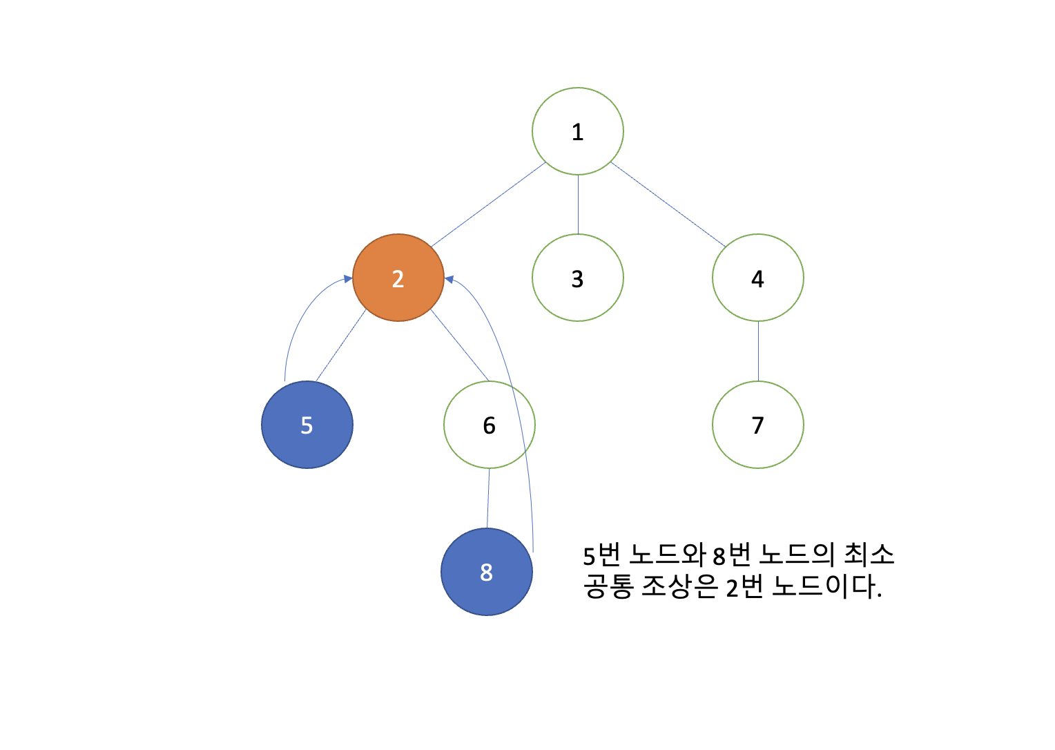 그림으로 다루진 않았지만 8과 7의 노드 사이의 최소공통조상은 배열에서 깊이가 1로 가장 작은 깊이를 갖는 노드 번호 1이 두 노드 사이의 최소 공통조상이 된다는 것을 알 수 있습니다.