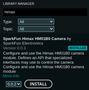 - Tools -> Manage Libraries에서 himax 검색 후 아래의 해당 라이브러리를 설치한다.